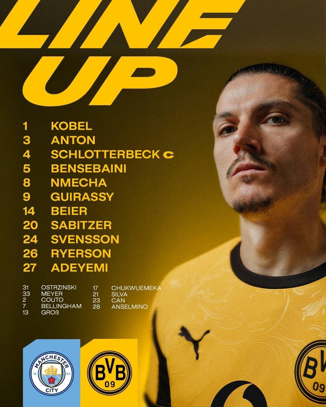 替補:31-奧斯特津斯基、33-邁爾、2-揚-科托、7-喬布-貝林厄姆、13-格羅斯、17-丘庫埃梅卡、21- 法比奧-席爾瓦、23-埃姆雷-詹、28-安塞爾米諾