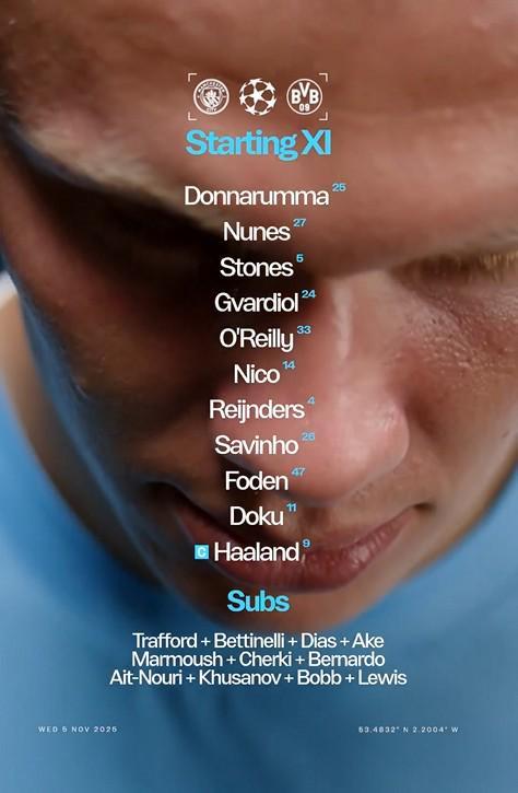 北京時間11月6日凌晨4點,歐冠聯(lián)賽階段第4輪展開一場焦點戰(zhàn)役,曼城對陣多特。賽前,雙方公布首發(fā)陣容。