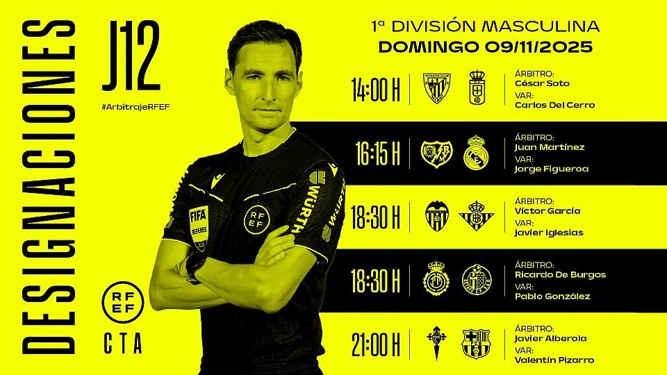 西班牙足協(xié)官方公布了周日西甲5場比賽的裁判名單,胡安-馬丁內斯將執(zhí)法巴列卡諾vs皇馬,哈維爾-阿爾韋羅拉將執(zhí)法塞爾塔vs巴薩。