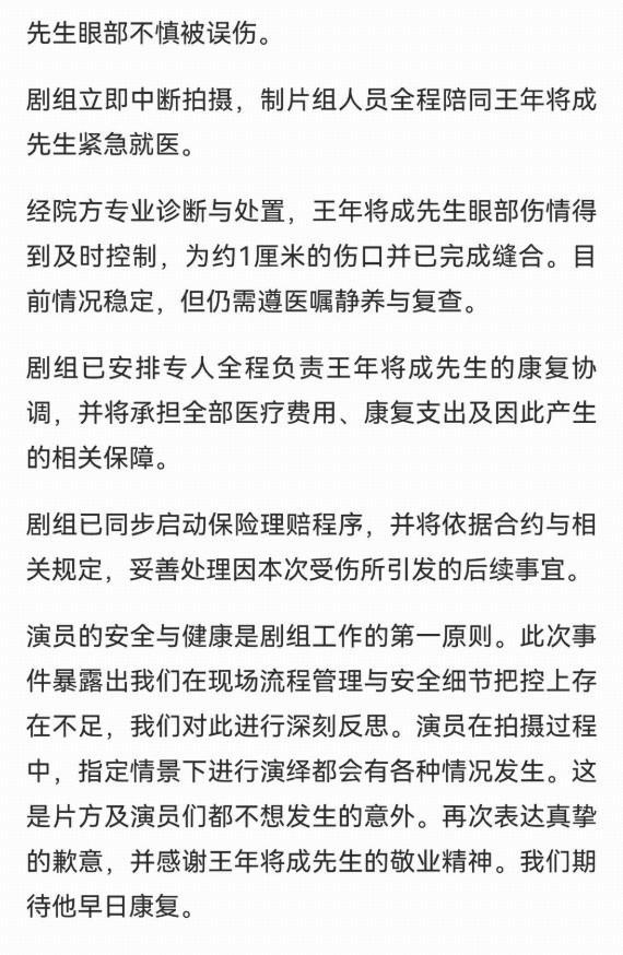 事后,對手演員也在社交媒體上表達了真誠道歉,劇組也發(fā)布聲明,表示已安排專人全程負責(zé)王年將成的康復(fù)協(xié)商,并將承擔(dān)全部醫(yī)療費用、康復(fù)支出及因此產(chǎn)生的相關(guān)保障。