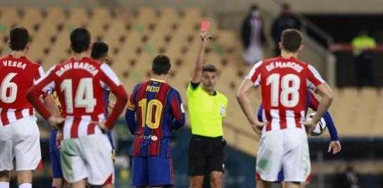 在2021年西班牙超級(jí)杯決賽中,曼薩諾直接紅牌罰下梅西,就此湊齊了對(duì)巴薩傳奇“MSN”三叉戟的罰下紀(jì)錄。當(dāng)時(shí),梅西在與畢爾巴鄂競(jìng)技球員比利亞利夫雷的糾纏中手臂有推搡動(dòng)作,被主裁判直接出示紅牌。